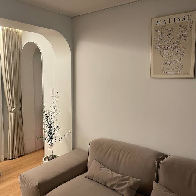 허전해 보였던 소파 옆에는 올리브 나무를 두고, 위에는 액자로 포인트를 주었어요. 거실에 아치 포인트를 많이 해서 이상해 보일까 걱정했는데 너무 예쁘더라고요.