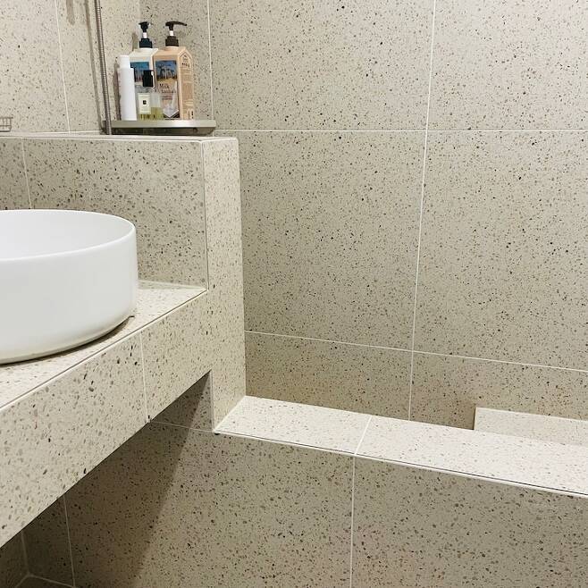 그리고 공간이 좁아 세면대는 작은 것밖에 선택지가 없었는데요. 타일 선반을 만들고 탑볼 세면대를 사용하니 더 통일감도 있고 넓어 보이고, 호텔 같은 느낌이 나요.