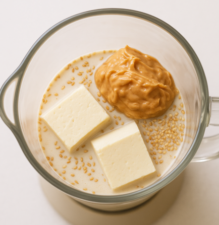 믹서에 두부, 땅콩버터, 통깨, 설탕, 소금, 물을 넣고 곱게 갈아주세요.고소하고 진한 콩국물이 완성돼요.Tip: 물 양으로 농도를 조절하세요.