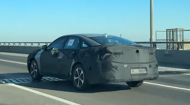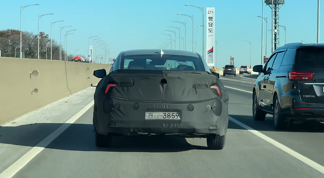 후면 리어 콤비네이션 램프는 아래로 내려갈수록 밖으로 퍼지는 ‘ㄱ’자 모양이며, K5와 흡사한 디자인임을 확인할 수 있다. 또한, 방향지시등은 시퀀셜 턴 시그널 방식이고, 트렁크 위쪽이 불룩하게 올라온 것으로 미뤄 리어 스포일러를 장착한 것으로 추측된다.