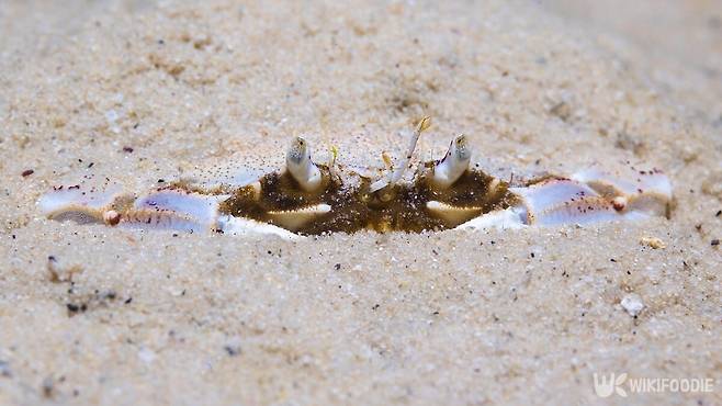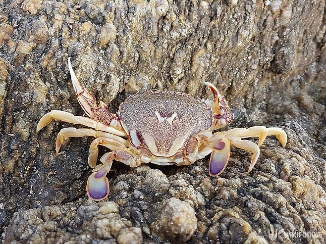 성체의 경우 갑각의 길이는 약 70mm 정도이며, 전체적으로 부채꼴 형상에 양옆 가장자리에는 5쌍의 톱니와 털이 나있다. 갑각 윗면은 볼록하고 전체에 작고 어두운 보랏빛 알갱이가 빽빽이 늘어서 있으며, 중앙에는 나비 모양의 흰 무늬가 있는 것이 특징이다.