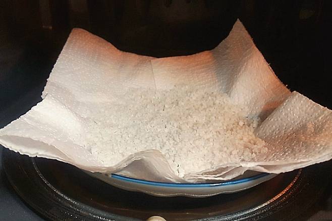 방법은 간단해요. 접시에 키친타월을 깔고 소금을 넓게 펴 주세요. 그다음 전자레인지에 넣고 30초 정도만 돌려주시면 끝! 소금의 눅눅한 정도에 따라 시간을 조금 더 추가하셔도 됩니다.
