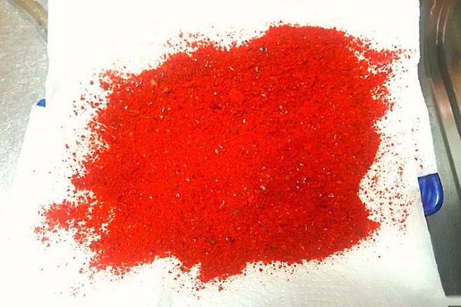 이때도 접시에 키친타월을 깔아주시고 그 위에 고춧가루를 넓게 펴 줍니다.