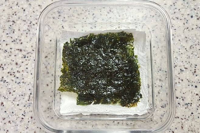 잠시 후 확인하시면 김이 다시 바삭바삭해졌는데요. 눅눅한 김은 힘이 없는데 이렇게 해주니 김색깔이 약간 파릇파릇해지면서 바삭해요. 식재료 눅눅해졌다 싶으면 이렇게 전자레인지를 활용해 보세요^^*