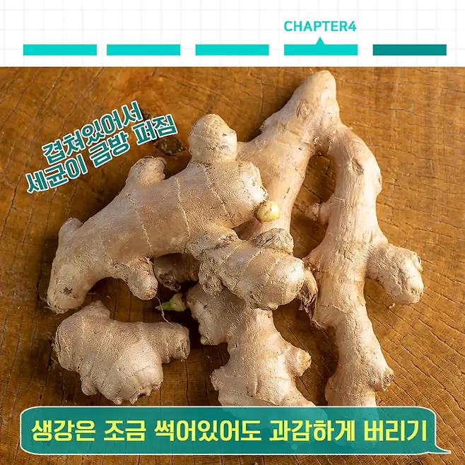 생강은 요리를 할 때 자주 들어가는데요. 생강은 조금만 썩어도 먹으면 안 된다고 해요. 그 이유는 생각 모양을 보면 겹쳐있는 부분이 많죠? 그래서 조금이라도 썩게 되면 빠르게 세균이 퍼지게 돼요.