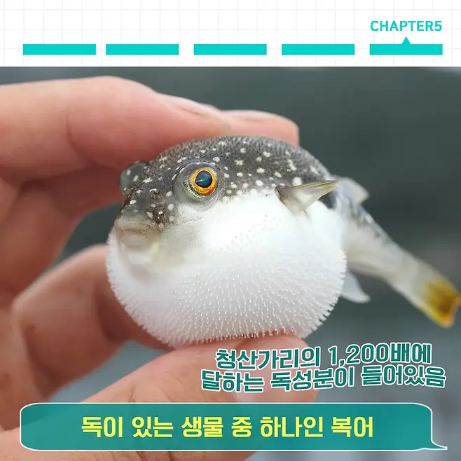 복어 간, 난소 알, 정소, 껍질 등에는 청산가리의 1,200배에 달하는 ‘테트로도톡신’이라는 독성분이 들어있어요. 이를 섭취할 경우 치사율은 60%에 이르게 되고 독성이 강한 것은 10g만 섭취해도 우리 몸에 치명적이라고 해요.
