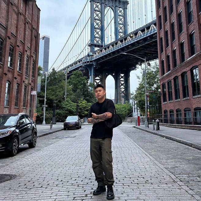 붉은 벽돌 건물과 거대한 철교가 어우러진 브루클린 거리 위에 선 나폴리 맛피아 권성준의 모습이 눈길을 끈다. 차분하면서도 강렬한 무드 속에서 블랙 톤의 상의와 카키 컬러 카고 팬츠를 매치해 도시적인 감각을 드러냈다. 이번 스타일링은 단순한 데일리룩을 넘어, 셰프로서의 개성과 자유분방한 에너지를 함께 담아내며 시선을 끈다.