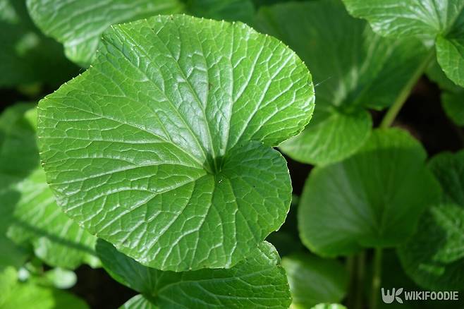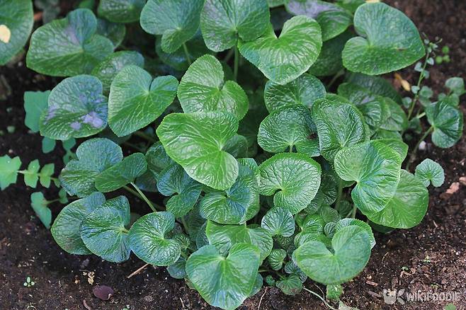 땅속줄기는 굵은 원기둥 모양이다. 줄기는 높이 20~40cm. 뿌리잎은 길이 30cm 정도인 잎자루가 있고, 심장 모양, 길이와 폭이 각각 8~10cm, 가장자리에 불규칙한 톱니가 있다. 줄기잎은 심장 모양이다.