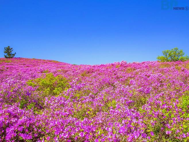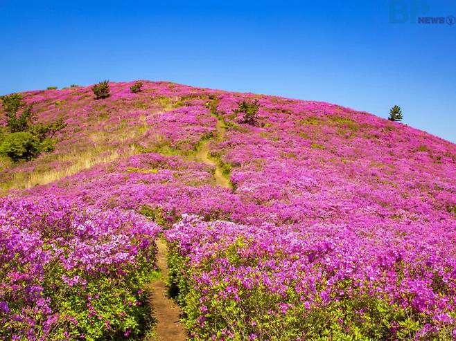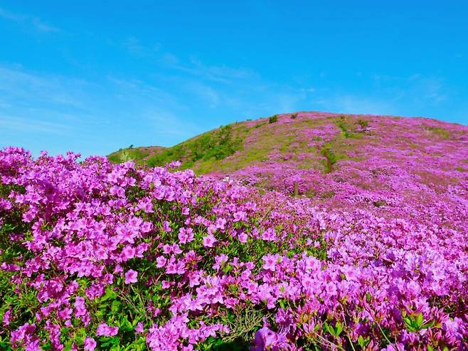남해를 내려다보는 산자락을 따라 연분홍빛 철쭉이 150㏊ 규모로 만개해 봄철 대표 여행지로 사랑받고 있다.
