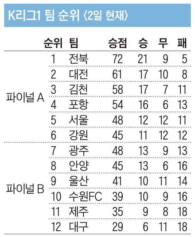 결국 수원FC와 대구, 어느 쪽도 웃지 못했다. 무승부에 머문 탓에 수원FC는 승점 39를 기록, 9위 울산(승점 41)에 뒤져 강등권을 벗어나지 못했고, 대구(승점 29)는 제주와 승점 6점 차 꼴찌에 머물렀다. 두 팀 모두 남은 3경기에 더욱 사활을 걸어야 할 상황이 됐다. 수원FC로선 오는 9일 울산 원정 경기가 운명의 한 판이 될 전망이다.