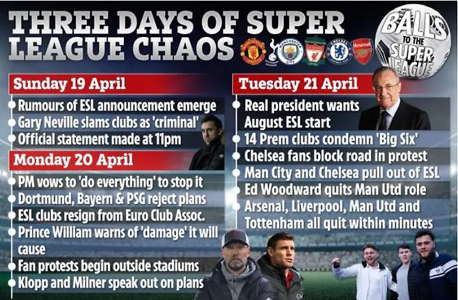 2021년 4월 18일이었다. 잉글랜드 프리미어리그의 아스널, 첼시, 리버풀, 맨체스터 시티, 맨체스터 유나이티드, 토트넘 홋스퍼, 스페인 라리가의 레알 마드리드, 바르셀로나, 아틀레티코 마드리드, 이탈리아 세리에 A의 AC 밀란, 인터 밀란, 유벤투스 등 12개 클럽이 유러피언 슈퍼리그(ESL) 출범을 공식 발표했다. 이들이 내건 주제는 '더욱 재미있는 경기, 더욱 많은 수익'이었다.