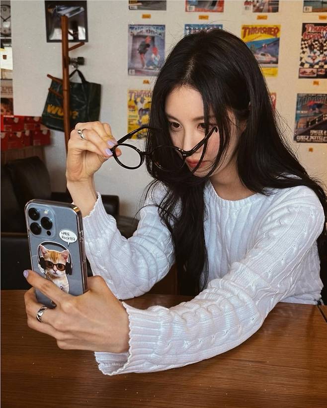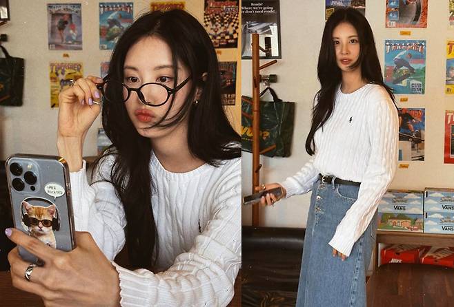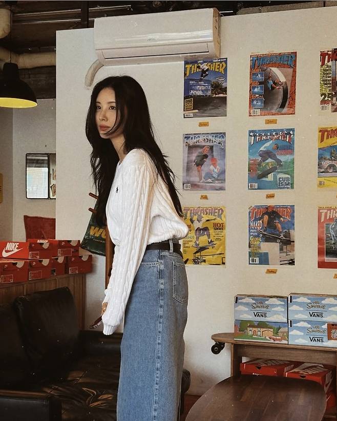 서현은 화이트 꽈배기 니트에 하이웨이스트 버튼 디테일이 살아 있는 데님 롱스커트를 매치해 소녀 감성과 청순한 분위기를 동시에 풍겼습니다.
