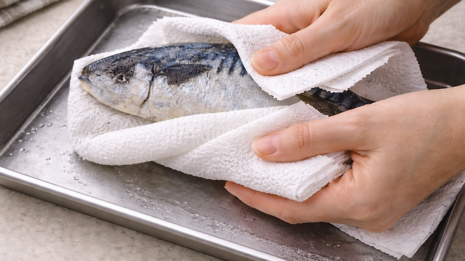 키친타월을 이용해 표면의 물기를 제거하면 조리 시 기름이 튀는 현상과 냄새 재발을 줄일 수 있다.
