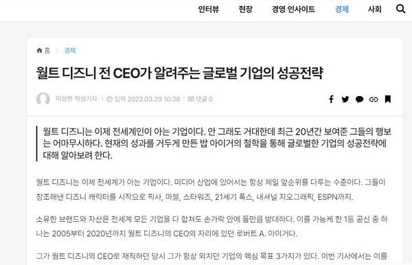 몇 년 전 본인은 사례뉴스에 현 디즈니 CEO 밥 아이거의 경영 철학을 칭송하는 기사를 게재했다.