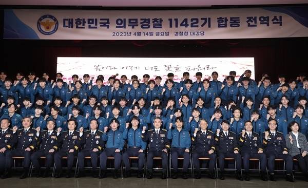 | ▲ ▲2023년 4월 14일 경찰청에서 열린 의경 1142기 합동 전역식과 윤희근 경찰청장 |