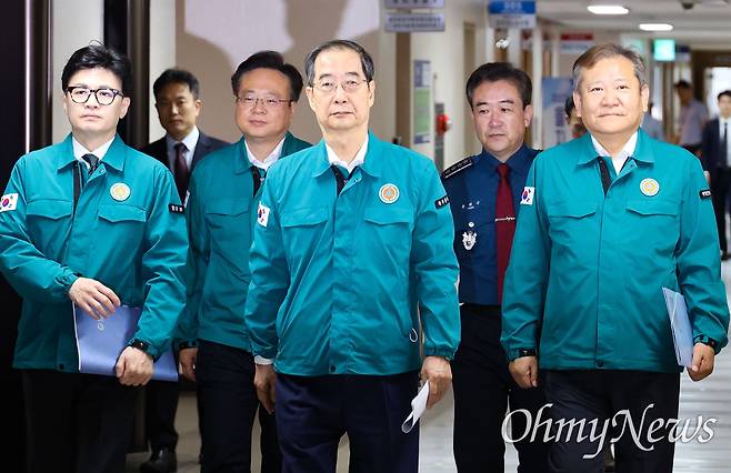 | ▲ 한덕수 총리가 이상민 행정안전부 장관, 한동훈 법무부장관, 조규홍 보건복지부장관, 윤희근 경찰청장과 함께 23일 오전 ‘이상동기 범죄 재발 방지를 위한 국무총리 담화문’을 발표하기 위해 정부서울청사 브리핑실에 들어오고 있다. |