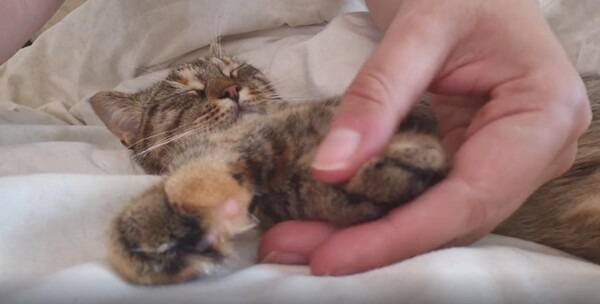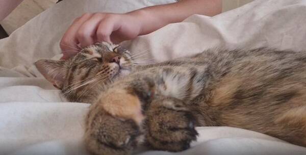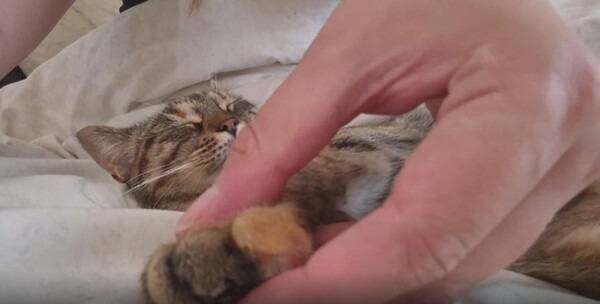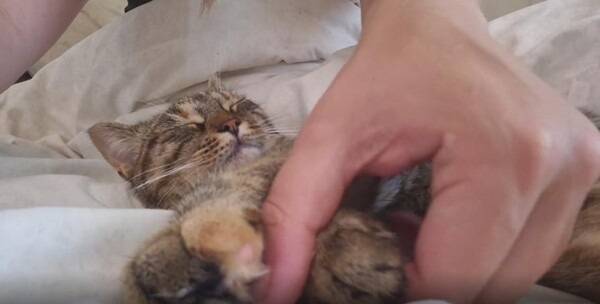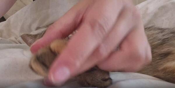 지그시 눈을 감은 채, 작은 고양이는 마치 꿈을 꾸는 듯한 표정이었습니다. 입꼬리가 살짝 올라가고, 귀는 느슨하게 옆으로 향한 채 긴장이 풀려 있었습니다. 마사지를 받을 때마다 살짝살짝 손가락이 움찔이며 반응하는 걸 보면, 이 감촉이 마냥 졸음 속에 묻혀 있는 건 아닌 듯했습니다. 사람의 말로 치자면 “이건... 천국이야” 정도의 만족이겠지요.