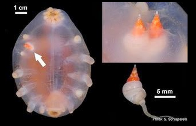 이뿐만이 아닌데요. 바다돼지는 다른 바다생물들의 훌륭한 집이 되어주기도 합니다. 작은달팽이는 바다 돼지에게 기생하며 내부의 장기를 먹고 체액을 영양분 삼아 산다고 합니다. 하지만 바다돼지는 뇌가 없기 때문에 자신의 몸에 기생하거나 붙어있는 생물들을 알아차리지 못합니다.