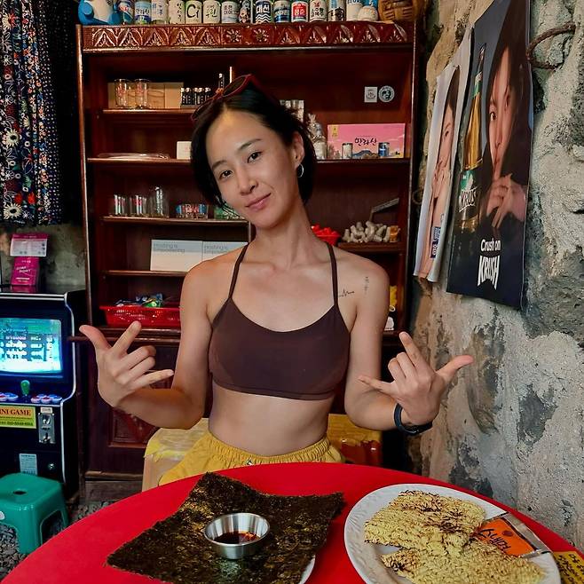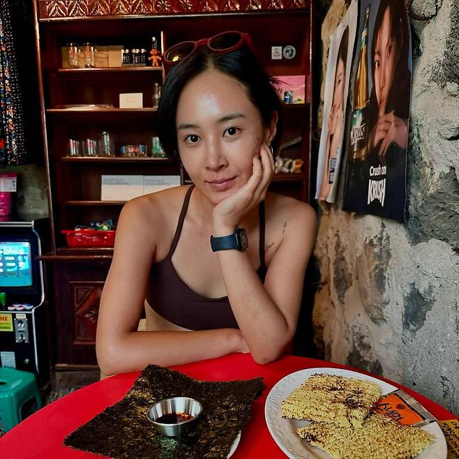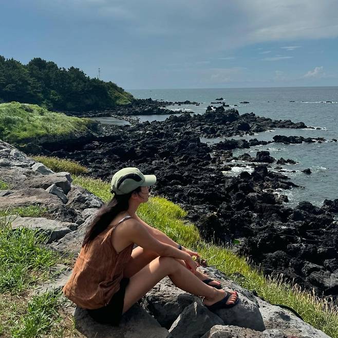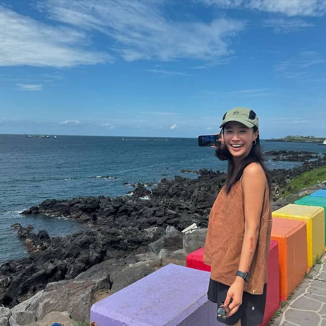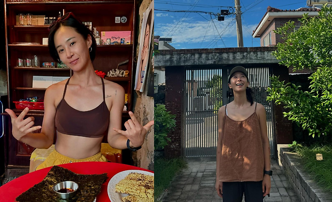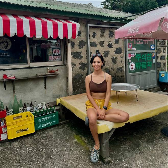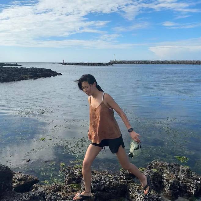 사진 속 유리는 브라운 탱크탑을 입고 겨자색의 팬츠를 입었고, 또 다른 사진에서는 브라운 나시와 블랙 바이커 팬츠를 입고 내추럴한 모습을 자랑했다.