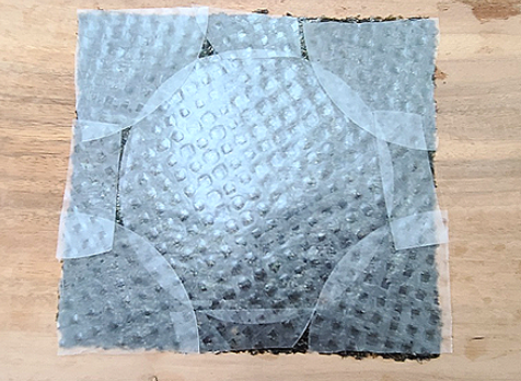 1. 라이스페이퍼를 적당한 크기로 자르고, 차가운 물에 적셔 김과 겹쳐 붙입니다. 눅눅한 김이라도 충분히 잘 붙어요.