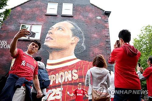 epaselect epa12136646 Fans Liverpool FC take pictures in front of a mural of the team's captain Virgil van Dijk as fans wait for the start of the victory parade in Liverpool, Great Britain, 26 May 2025. Liverpool are celebrating the club's 20th English league title win with an open top bus parade. EPA/ADAM VAUGHAN
