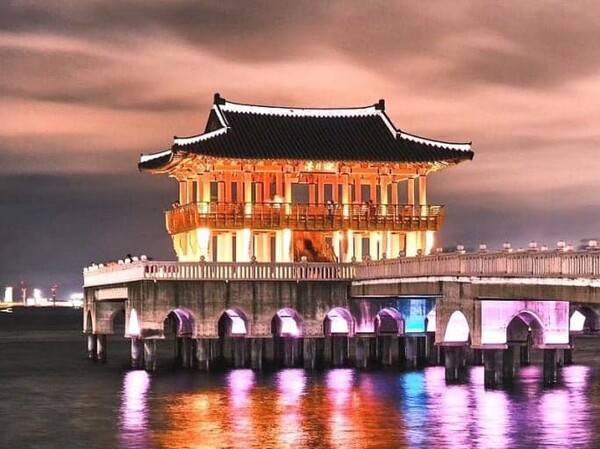 영일대 해상누각은 전통 목조건축의 미를 살린 외관과 바다를 조망할 수 있는 전망데크가 특징입니다. 밤에는 경관 조명 덕분에 또 다른 분위기를 자아내며, 포항의 야경 명소로도 손꼽힙니다.