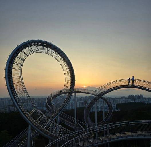 환호공원에 위치한 스페이스워크는 포스코가 첨단 스틸 소재로 만든 대형 예술 작품이자 전망대입니다. 롤러코스터를 닮은 곡선형 트랙을 따라 걸으며 360도 파노라마로 펼쳐지는 영일만과 포항 시내, 바다, 그리고 포스코 제철소의 야경까지 한눈에 담을 수 있습니다.