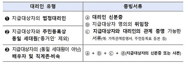 다만, 직접 신청이 어렵다면 △법정대리인 △주민등록상 동일 세대원 △동일 세대원이 아닌 배우자나 직계존/비속이 대리인 신분증과 위임장 등을 지참하고 지급대상자 주소지 관할 주민센터에 방문하면 지급받을 수 있습니다.