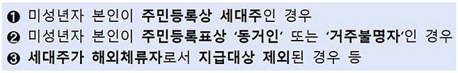-> 2007년 1월 1일 이후 출생한 미성년자는 동일 주소지 내 세대주가 신청 및 수령하는 것이 원칙입니다.