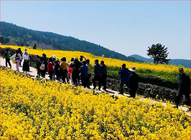 단체 여행의 묘미: 청산도는 가족이나 모임 단위로 옷을 맞춰 입고 온 상춘객들이 유독 많습니다. 노란 꽃밭을 배경으로 밝은 색 옷을 입고 사진을 찍으면 더욱 화사한 인생샷을 남길 수 있습니다.