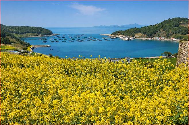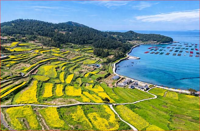 층층이 쌓인 다랭이 논마다 피어난 유채꽃과 빨간 지붕의 하얀 건물이 조화를 이루는 풍경은, 높은 지대에서 내려다보는 푸른 바다와 맞닿아 '봄의 왈츠'라는 이름처럼 경쾌하고도 서정적인 미학을 선사합니다.