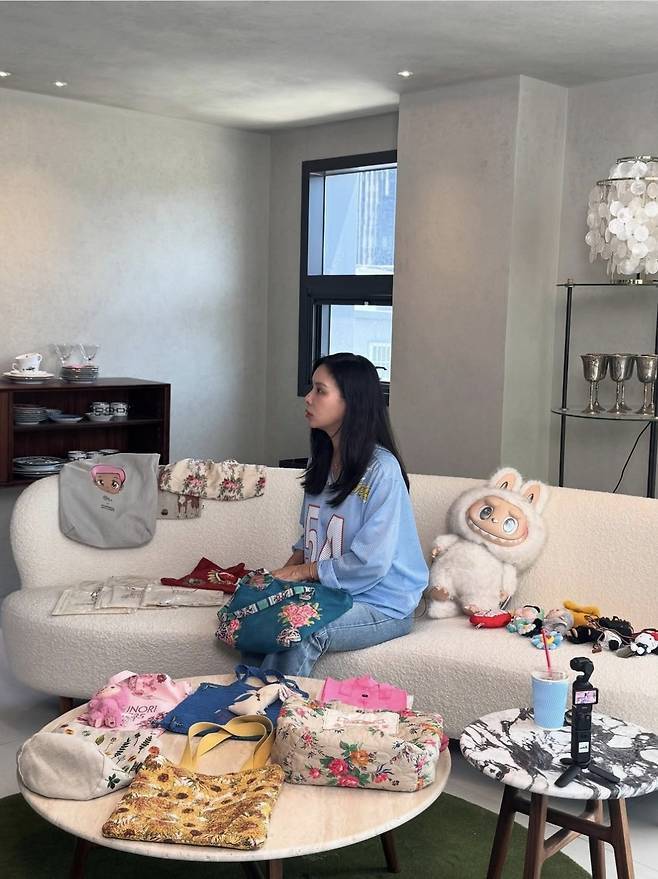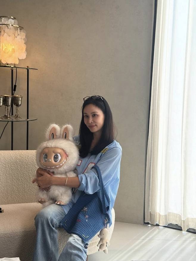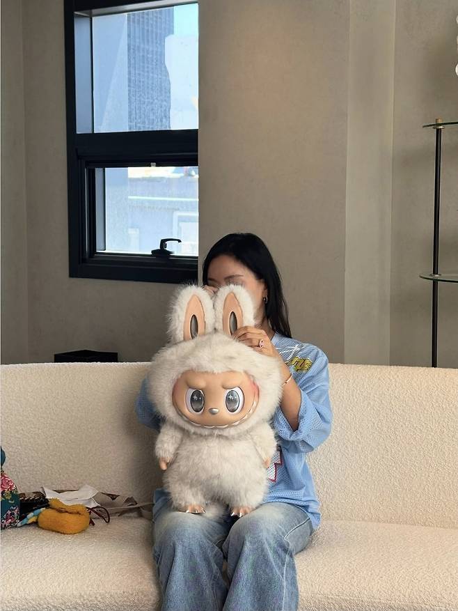 자연스럽게 늘어뜨린 헤어와 미니멀한 메이크업이 수수한 이미지를 강조했으며, 품에 안은 라부부 피겨와 함께한 모습이 스타일리시하면서도 유쾌한 분위기를 자아냈습니다.