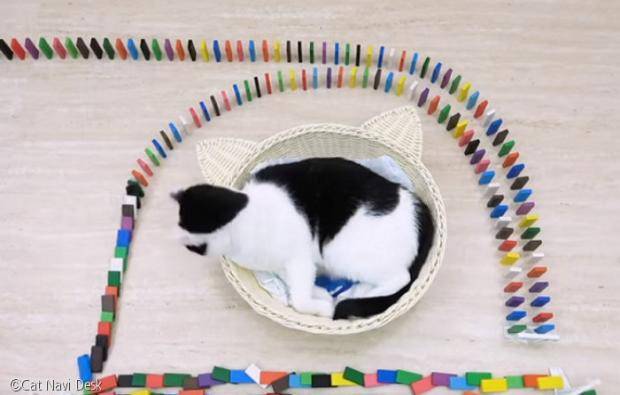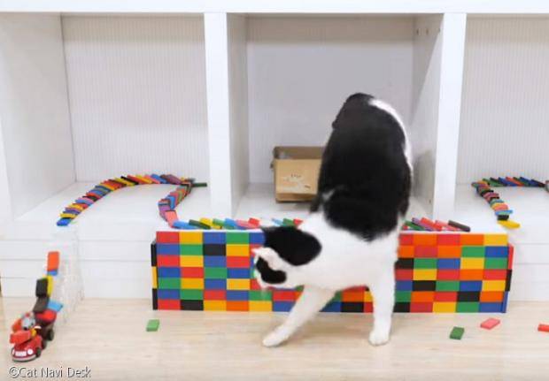 집사는 구간마다 고양이들이 참여할 수 있는 트릭을 만들었는데 고양이들은 특정 부분에서 제 역할을 하며 도미노가 이어질 수 있도록 힘을 보탠다.