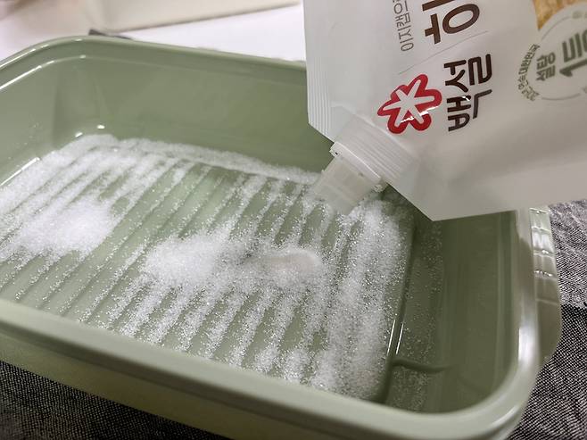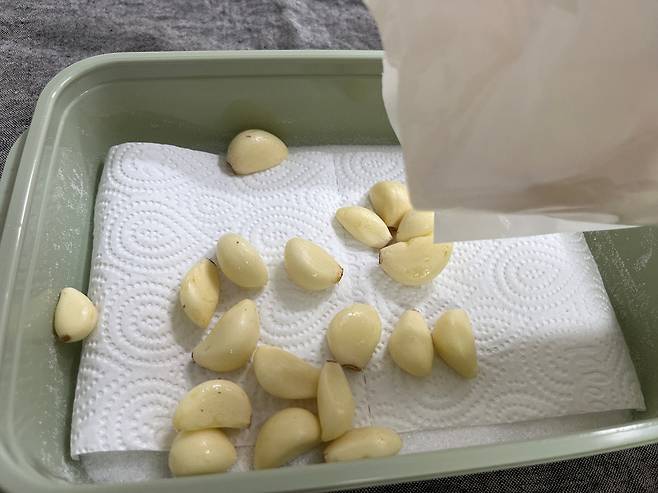 그 위에 키친타월을 한 겹 깔고 마늘을 보관하세요. 키친타월이 남은 습기를 한 번 더 흡수해 마늘이 눅눅해지는 것을 막아주고, 통풍 효과까지 있어 보관 기간을 더 늘릴 수 있습니다. 설탕 → 키친타월 → 마늘 순으로 보관하면 훨씬 오래 신선하게 유지됩니다.