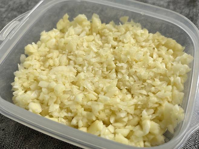 양파의 수분과 단맛이 더해져 마늘이 더 부드럽게 갈리고 알싸한 매운맛도 완화됩니다. 또한 두 재료가 만나면 감칠맛이 살아나 양념, 볶음 요리의 풍미가 더욱 깊어집니다. 이제 다진 마늘 만들 때는 양파를 꼭 섞어서 만드세요.