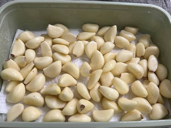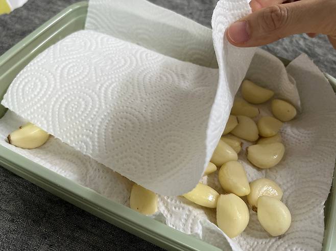 그 위에 키친타월을 한 겹 깔고 마늘을 보관하세요. 키친타월이 남은 습기를 한 번 더 흡수해 마늘이 눅눅해지는 것을 막아주고, 통풍 효과까지 있어 보관 기간을 더 늘릴 수 있습니다. 설탕 → 키친타월 → 마늘 순으로 보관하면 훨씬 오래 신선하게 유지됩니다.