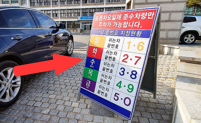 차량 5부제는 번호판 끝자리 숫자 10개(0~9)를 2개씩 묶어 요일별로 배정한다. 운행 제한 요일은 다음과 같다.