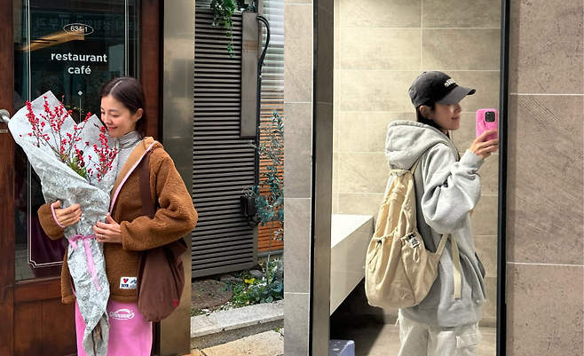 공개 된 사진 속 김성은은 스트라이프 터틀넥 티를 입고 핑크색의 조거팬츠를 입어 캐주얼함을 선보였다. 또한 브라운 뽀글이와 숄더백을 걸쳐 꾸안꾸 데일리룩을 자랑했다. 또한 그레이 컬러의 후드티와 팬츠를 입고 블랙 컬러의 캡모자와 가방을 매서 캐주얼한 동안 스타일링을 자랑했다.