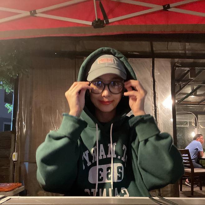 짙은 녹색 후드 티셔츠를 착용하여 편안하면서도 생동감 있는 분위기를 연출했다. 후드 위로 옅은 색상의 볼캡을 착용하고, 검은 뿔테 안경을 매치해 꾸밈없는 듯하면서도 포인트를 주는 스타일링을 완성했다. 티셔츠 중앙의 빈티지한 느낌을 주는 레터링 프린트는 룩에 재미를 더한다.