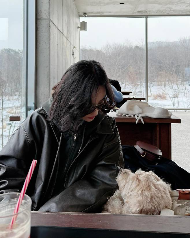 광택이 도는 오버사이즈 레더 재킷으로 시크하고 강렬한 인상을 남겼다. 재킷 안에는 검은색 후드를 레이어드하여 보온성을 높이는 동시에 캐주얼한 느낌을 가미했다. 독특한 프레임의 안경은 자칫 단조로울 수 있는 스타일에 지적인 포인트를 더하며 패션 센스를 드러냈다.