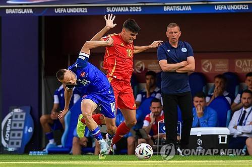 epa12170224 Nino Marcelli of Slovakia (L) in action against Gerard Martin of Spain (R) during the UEFA Under-21 Championship group stage match between Slovakia and Spain in Bratislava, Slovakia, 11 June 2025. EPA/MARTIN DIVISEK