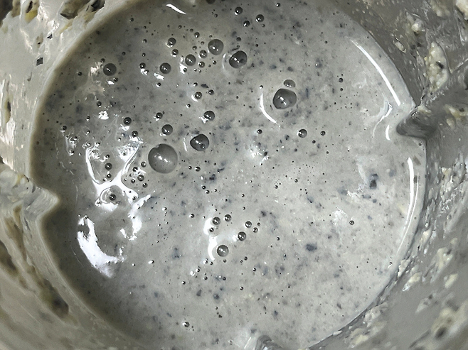 뚜껑을 닫고 믹서기를 작동시켜 콩을 곱게 갈아 주세요. 너무 뻑뻑한 경우 물을 조금 더 추가합니다.