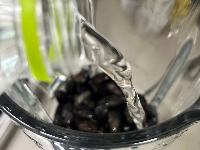 식힌 콩을 믹서에 넣고 물은 콩의 양의 약 1.5배를 넣습니다. 원하는 농도에 맞춰 물의 양은 조절해 주세요.