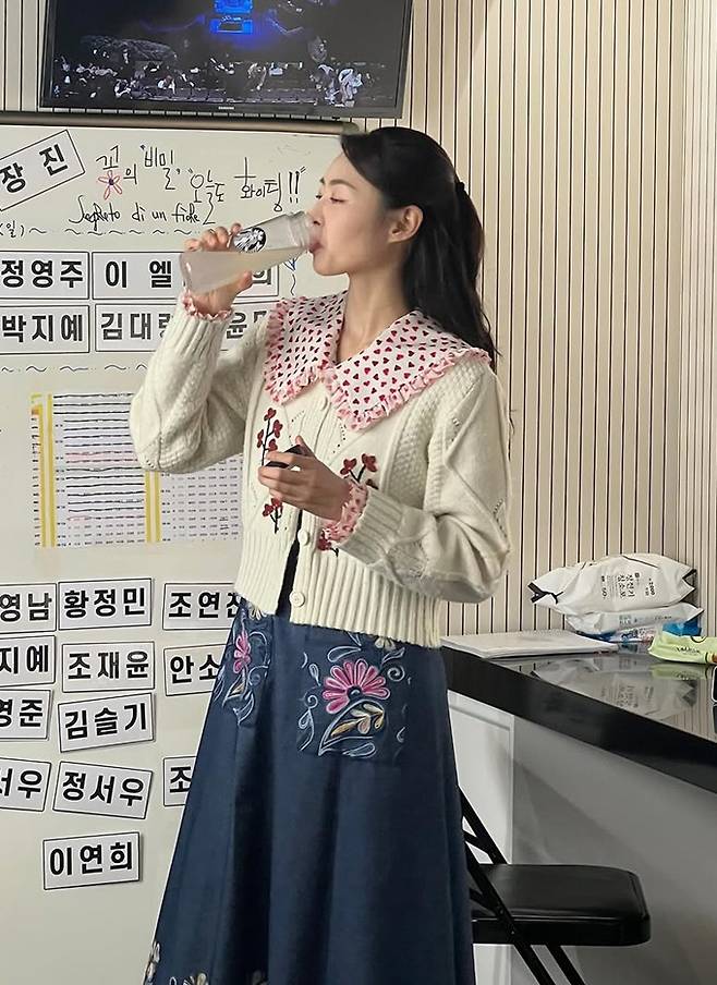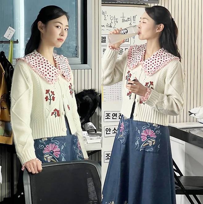 공개한 사진에서 이연희는 꽃무늬 자수가 예쁜 블루 컬러의 스커트와 니트 카디건을 입고 러블리하면서도 청순한 출근룩을 선보였다.