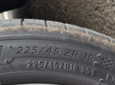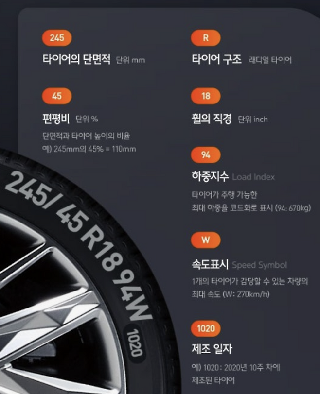 모든 타이어 옆면에는 '245 / 45 R 18 100 W' 와 같은 형식의 숫자들이 적혀 있습니다.