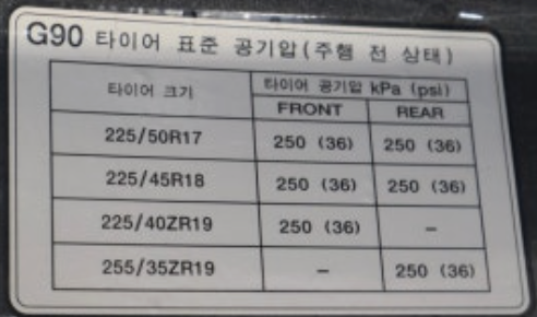 이 스티커에는, 자동차 제조사가 수많은 테스트를 거쳐 찾아낸, 당신의 차에 가장 완벽하고 안전한 **'순정 타이어 사이즈'**와 **'권장 공기압'**이 모두 적혀 있습니다.