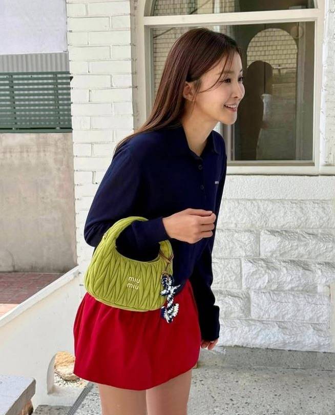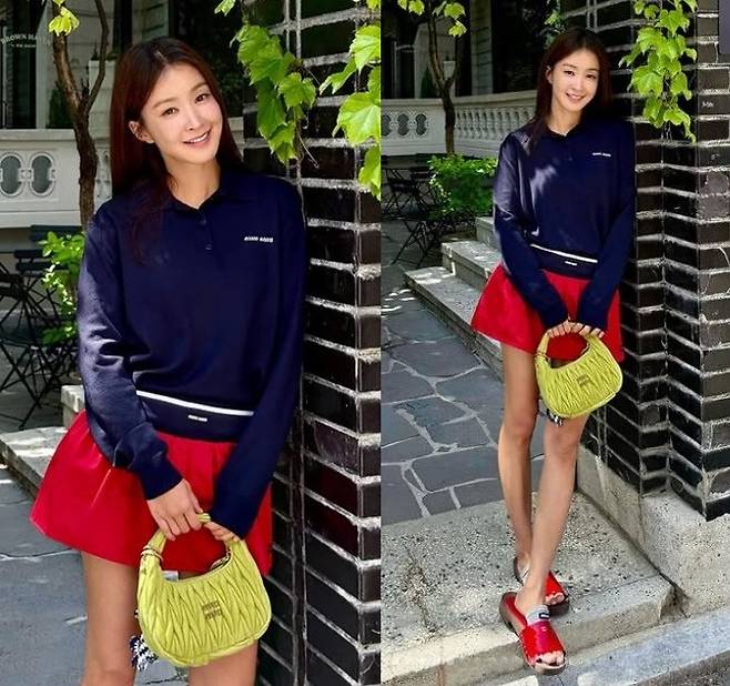 공개된 사진 속 이시영은 네이비 브이넥 니트와 강렬한 레드 컬러의 복서 스커트를 매치한 상큼발랄한 스쿨룩으로 눈부신 각선미를 뽐냈다.