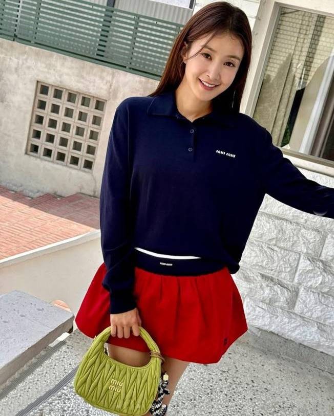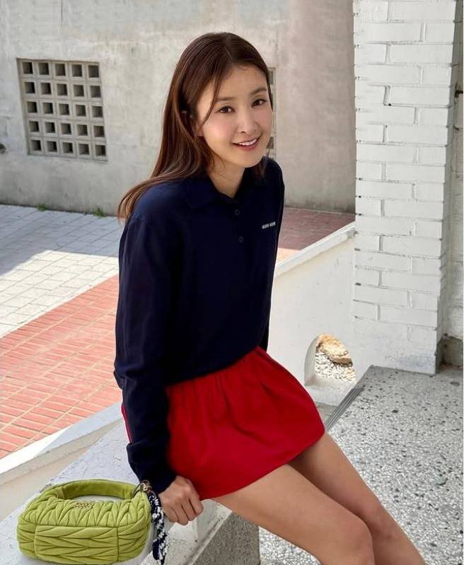 배우 이시영이 레드 컬러 복서 스커트룩으로 러블리 스쿨룩을 선보였다.
