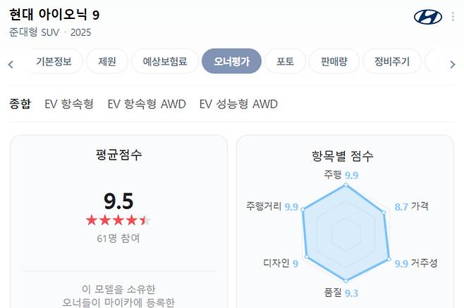 실제 차주들의 평가를 기반으로 차량 만족도 점수를 공개하는 ‘네이버 마이카 오너평가’에 따르면 현대차 아이오닉 9의 오너평가 점수는 9.5점이다. 가격을 제외한 모든 항목이 9점 이상의 높은 평가를 받았다.