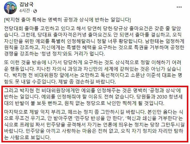 ◆ 박지현> 그때 적용을 했던 거를 해달라기보다는 이렇게 달리 정할 수 있다는 규정이 있으니까 이번에도 당에서 판단을 해달라라는 말씀인데요. 그런데 김남국 의원께서 SNS에 굉장히 비판하는 글을 올리셨더라고요.